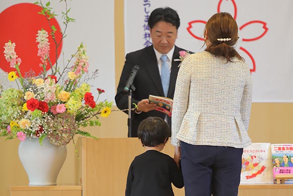 青嵐認定こども園・とくしま健祥会保育園では中村晃子本部長より絵本が手渡されました。