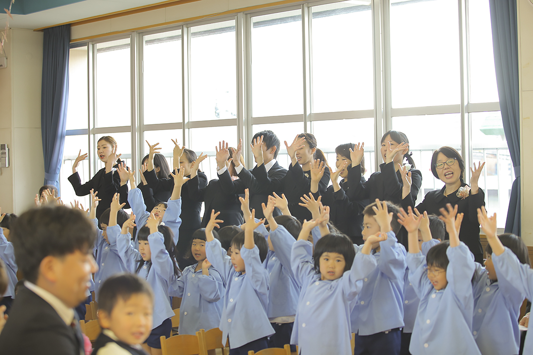 新しい友だちの仲間入りをお祝いして、在園児たちが元気いっぱいのメッセージや二宮金次郎の歌、チューリップの歌やむすんでひらいての手遊び、園歌「あしたを呼びに行こう」を披露。泣いていた子も泣き止んで在園児に見入ったり、見よう見まねで手遊びをしたり、微笑ましい姿を見せてくれました。