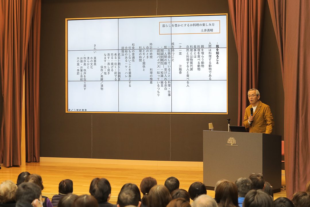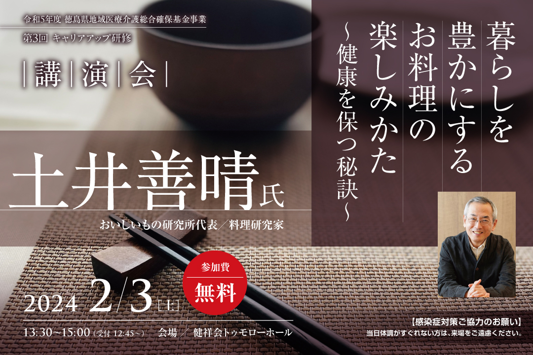 徳島県地域医療介護総合確保基金事業第3回キャリアアップセミナーとして、健祥会トゥモローホールで料理研究家土井善晴さんの講演会が開催され、ホールいっぱいの350名の地域の皆さんが熱心に耳を傾けてくださいました。