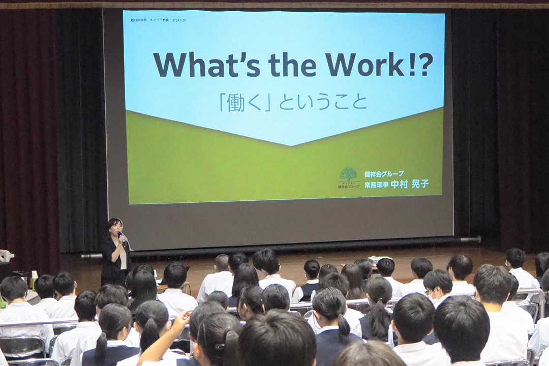 健祥会グループ常務理事中村晃子が、徳島県の実施する「学校におけるキャリア教育を支援するための講演・出前授業」の講師として依頼を受け、板野郡の藍住中学校の2年生の皆さんに「What’s the Work?『働く』ということ」と題してお話をさせていただきました。