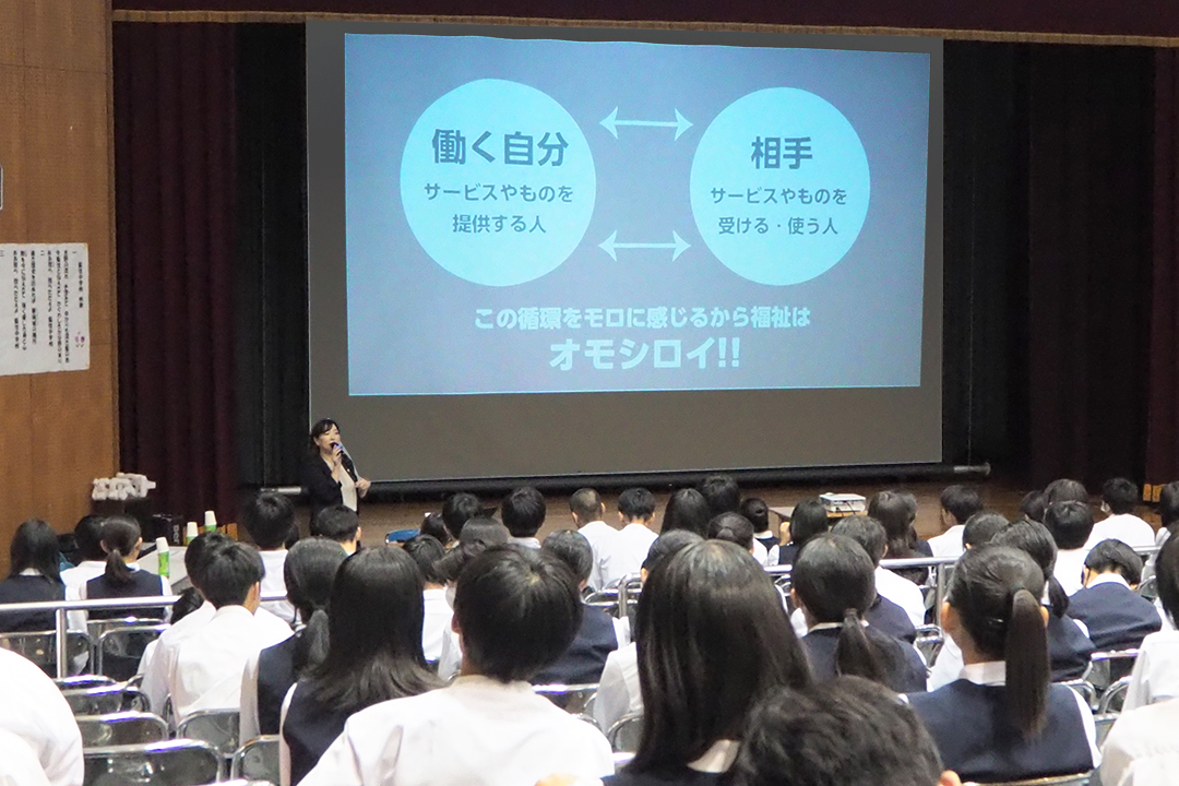 後半では、働くことの意味、対人業務だからこその福祉の世界の面白さなどに言及。働くことは能力と仕事への想いの掛け算であり、どちらも後天的にいくらでも高めていけると熱く語りました。