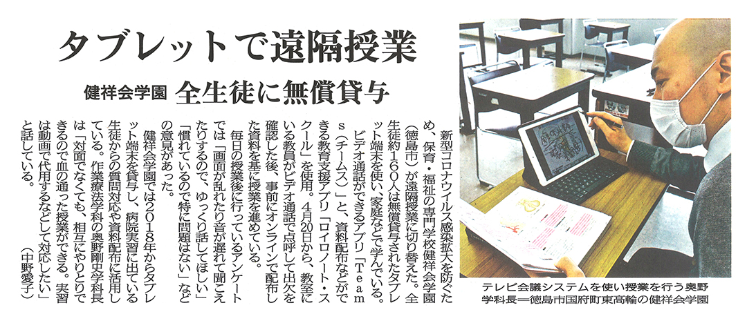 この記事は公開から1年以上経過しています メディア掲載記事 2020年5月12日(火) タブレットで遠隔授業 | 徳島新聞 ■徳島新聞(2020年5月12日朝刊) ※掲載内容は4月24日取材時点のものです。 [記事公開日]2020/05/12(火) タブレットで遠隔授業 | 徳島新聞 新しい記事 健康経営法人に 県関係34社・団体 | 徳島新聞 古い記事 理学療法学科・作業療法学科 授業料大幅減額! 【専門学校 健祥会学園】 過去の記事へ