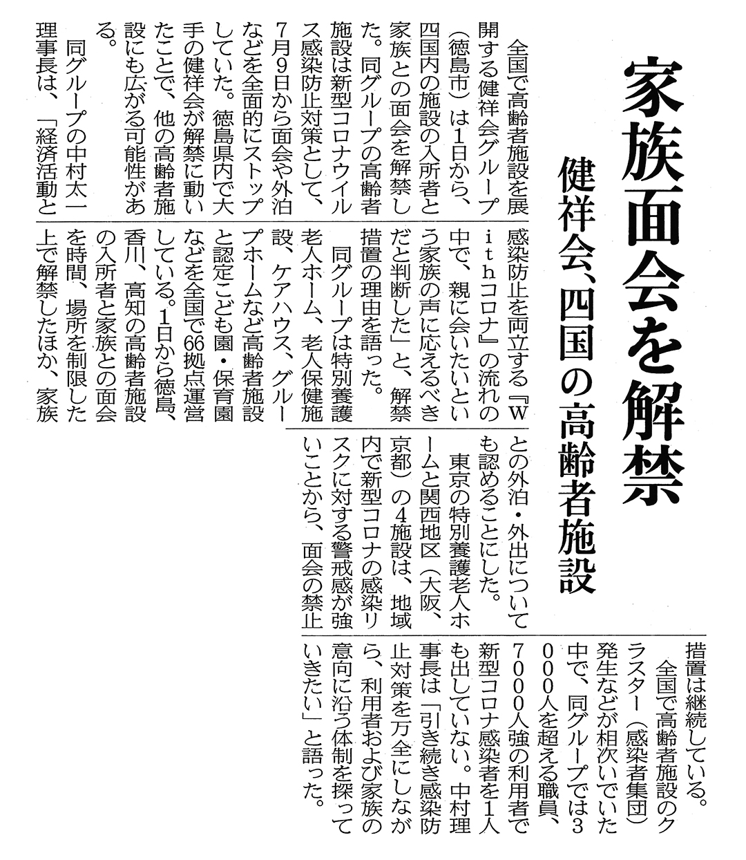この記事は公開から1年以上経過しています メディア掲載記事 2020年10月2日(金) 家族面会を解禁 | 日本経済新聞 ■日本経済新聞(2020年10月2日朝刊) [記事公開日]2020/10/02(金) 家族面会を解禁 | 日本経済新聞 新しい記事 密を避けて少人数で 防災訓練実施 古い記事 不審者の侵入 さすまたで対応 | 徳島新聞 過去の記事へ