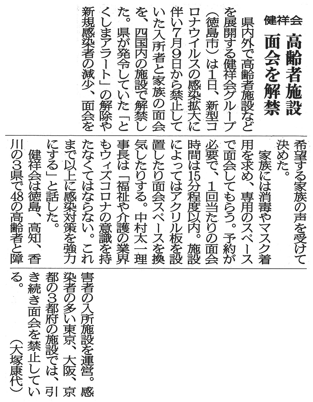 高齢者施設 面会を解禁|徳島新聞