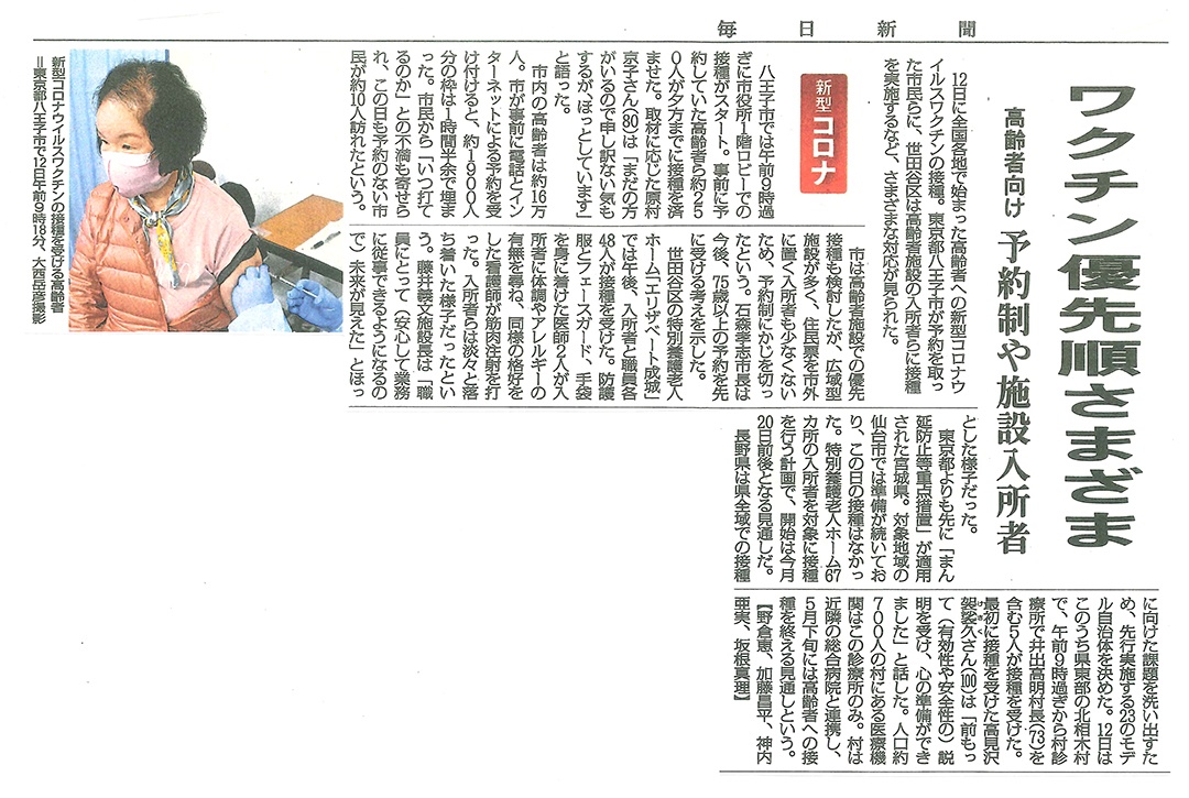 この記事は公開から1年以上経過しています メディア掲載記事 2021年4月13日(火) ワクチン優先順さまざま | 毎日新聞 ■毎日新聞(2021年4月13日朝刊) [記事公開日]2021/04/15(木) エリザベート成城 ワクチン優先順さまざま | 毎日新聞 新しい記事 手探りで接種開始 | 毎日新聞 古い記事 高齢者接種 悩み深く | 読売新聞 過去の記事へ