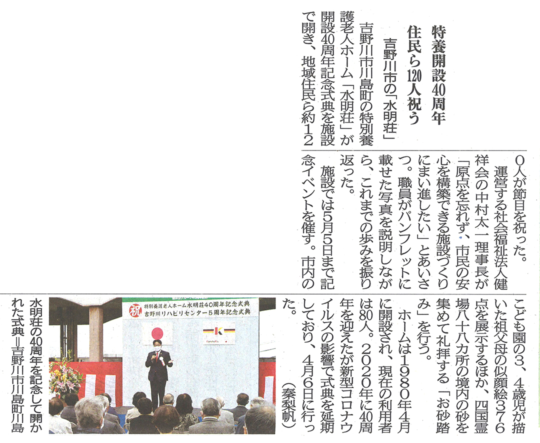 この記事は公開から1年以上経過しています メディア掲載記事 2021年4月17日(土) 特養開設40周年 住民ら120人祝う | 徳島新聞 ■徳島新聞(2021年4月17日朝刊) [記事公開日]2021/04/17(土) [最終更新日]2021/07/07(水) 水明荘 特養開設40周年 住民ら120人祝う | 徳島新聞 新しい記事 高齢者施設でのワクチン接種 2市5町で始まる | 徳島新聞 古い記事 「安心した」「痛くない」 | 東京新聞 過去の記事へ