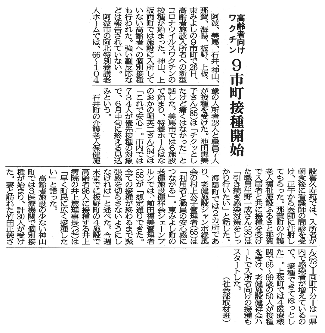 この記事は公開から1年以上経過しています メディア掲載記事 2021年4月27日(火) 高齢者向けワクチン 9市町接種開始 | 徳島新聞 ■徳島新聞(2021年4月27日朝刊) [記事公開日]2021/04/27(火) ジャンボ緑風会ふるさと那賀健祥会シェーンブルン健祥会ハート 高齢者向けワクチン 9市町接種開始 | 徳島新聞 新しい記事 第40回徳島オープンゲートボール選手権大会 第17回健祥会杯グラウンド・ゴルフ大会 第18回健祥会カップバレーボール大会中止のお知らせ 古い記事 新型コロナウイルス感染症対策功労者として知事より感謝状 過去の記事へ