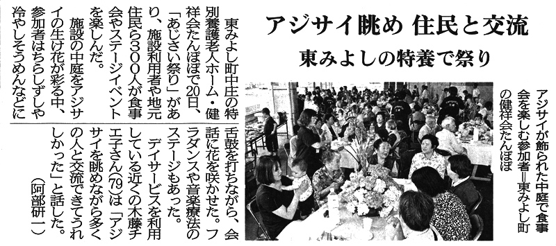 この記事は公開から1年以上経過しています メディア掲載記事 2015年6月23日(火) アジサイ眺め 住民と交流│徳島新聞 健祥会たんぽぽで行われたあじさい祭りの様子が徳島新聞に掲載されました ■徳島新聞(2015/06/23掲載) 健祥会たんぽぽ [記事公開日]2015/06/23(火) 健祥会たんぽぽ アジサイ眺め 住民と交流│徳島新聞 新しい記事 音楽療法の世界的権威 マイケル・ローバッカー博士来設 古い記事 「移住に適した地域」に県東部 過去の記事へ