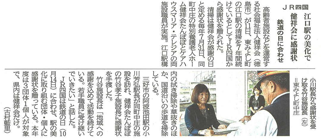 この記事は公開から1年以上経過しています メディア掲載記事 2021年10月14日(木) 江口駅の美化で健祥会に感謝状丨徳島新聞 ■徳島新聞(2021年10月14日朝刊) [記事公開日]2021/10/14(木) マリア・テレジア健祥会たんぽぽ感謝状 江口駅の美化で健祥会に感謝状丨徳島新聞 新しい記事 秋空のように晴れやかな笑顔で 認定こども園「人間力づくり運動会」 古い記事 清掃は一番身近な地域貢献〜感謝状とアドプトと 過去の記事へ