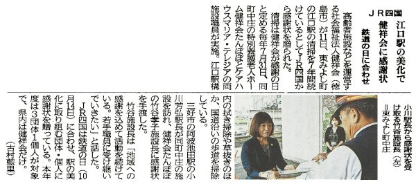 江口駅の美化で健祥会に感謝状丨徳島新聞