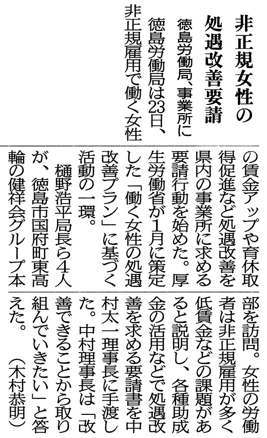 厚生労働省で策定された「働く女性の処遇改善プラン」推進のために、徳島労働局では「均衡待遇実現キャンペーン」をスタート。キャンペーンの一環として県内企業への要請活動が実施されることとなり、健祥会グループが第一号の訪問先として選ばれ、徳島労働局長、徳島県商工労働部副部長らがグループ本部を訪れました。 その様子が徳島新聞に掲載されました。
