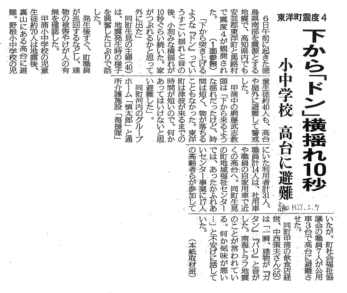 この記事は公開から1年以上経過しています メディア掲載記事 2015年2月7日(土) 下から「ドン」横揺れ10秒│高知新聞 2/6午前に発生した地震の際の対応が高知新聞に掲載されました。 地震発生!利用者様を守って迅速的確に避難 グループホーム慎太郎、デイサービスセンター海援隊 ■高知新聞2015/02/07掲載 [記事公開日]2015/02/12(木) 下から「ドン」横揺れ10秒│高知新聞 新しい記事 サービスの質と量を維持し、利用者をまもっていくために 〜健祥会グループ介護保険研修会 古い記事 糖尿病予防法学ぶ 美馬の老健施設│徳島新聞 過去の記事へ