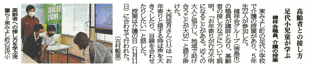 この記事は公開から1年以上経過しています メディア掲載記事 2021年12月4日(土) 高齢者との接し方 足代小児童が学ぶ|徳島新聞 ■徳島新聞(2021年12月4日朝刊) [記事公開日]2021/12/04(土) 介護出張講座健祥会シェーンブルン健祥会たんぽぽ 高齢者との接し方 足代小児童が学ぶ|徳島新聞 新しい記事 今年も「にっこりホッと」なエピソード大集合 古い記事 認知症サポーターを養成 | 徳島新聞 過去の記事へ