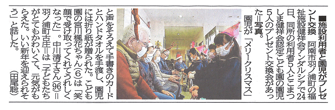 この記事は公開から1年以上経過しています メディア掲載記事 2021年12月25日(土) 施設利用者と園児がプレゼント交換 | 徳島新聞 ■徳島新聞(2021年12月25日朝刊) [記事公開日]2021/12/25(土) 健祥会アンダルシア 施設利用者と園児がプレゼント交換 | 徳島新聞 新しい記事 お年寄りの生活 擬似体験 | 徳島新聞 古い記事 小松島市長が出張サンタ | 徳島新聞 過去の記事へ