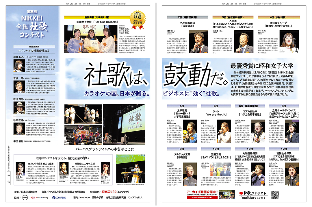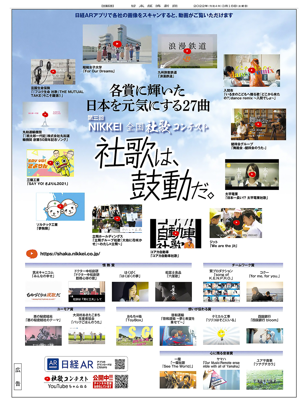 この記事は公開から1年以上経過しています メディア掲載記事 2022年3月16日(水) 第三回 全国社歌コンテスト 社歌は鼓動だ。 | 日本経済新聞 ■日本経済新聞(2022年3月16日朝刊) [記事公開日]2022/03/16(水) [最終更新日]2022/03/18(金) 第三回 全国社歌コンテスト 社歌は鼓動だ。 | 日本経済新聞 新しい記事 職員が「チャレンジドとくしま賞」を受賞 古い記事 「ふるさと那賀」に待望の職員寮 緑風会ドミトリー起工式 過去の記事へ