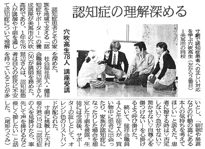 この記事は公開から1年以上経過しています メディア掲載記事 2015年11月28日(土) 認知症の理解深める│徳島新聞 穴吹高校(美馬市)で開催した認知症サポーター養成講座の記事が徳島新聞に掲載されました。 ■徳島新聞(2015/11/28掲載) [記事公開日]2015/12/02(水) 認知症サポーター養成講座 認知症の理解深める│徳島新聞 新しい記事 来年が幸せな年でありますように 〜4保育園でお餅つき 古い記事 栄養も、おいしさも美しさも大切に 28施設の厨房による料理コンテスト開催 過去の記事へ
