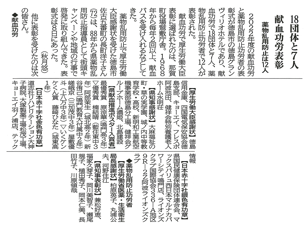 この記事は公開から1年以上経過しています メディア掲載記事 2022年11月24日(木) 18団体と7人 献血功労表彰 | 徳島新聞 ■徳島新聞(2022年11月24日朝刊) [記事公開日]2022/11/24(木) 濃姫 18団体と7人 献血功労表彰 | 徳島新聞 新しい記事 グラウンドゴルフ 第17回 健祥会グループ杯大会 | 徳島新聞 古い記事 介護食 味や食感は | 徳島新聞 過去の記事へ