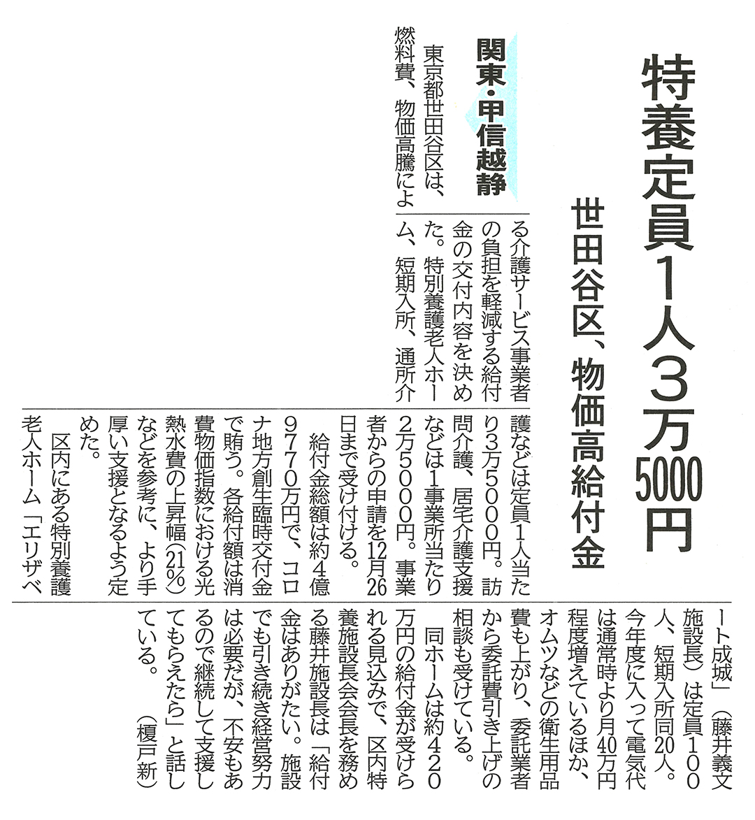 この記事は公開から1年以上経過しています メディア掲載記事 2022年12月6日(火) 特養定員1人3万5000円 | 福祉新聞 ■福祉新聞(2022年12月6日週刊) [記事公開日]2022/12/07(水) エリザベート成城 特養定員1人3万5000円 | 福祉新聞 新しい記事 グラウンドゴルフ 第17回 健祥会グループ杯南太平洋大会 | 徳島新聞 古い記事 グループホーム「健祥会こころ」 最初の入居者様を迎えて 過去の記事へ