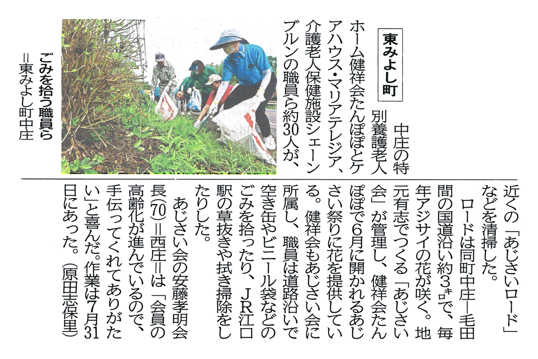 この記事は公開から1年以上経過しています メディア掲載記事 2023年8月8日(火) 道路掃除 力合わせ 東みよし町 | 徳島新聞 ■徳島新聞(2023年8月8日朝刊) [記事公開日]2023/08/09(水) マリア・テレジア健祥会たんぽぽ 道路掃除 力合わせ 東みよし町 | 徳島新聞 新しい記事 ゲートボール 第39回 全日本選手権徳島県予選 | 徳島新聞 古い記事 夏をいっしょに楽しみましょう! 各地で夏まつり・納涼祭 過去の記事へ