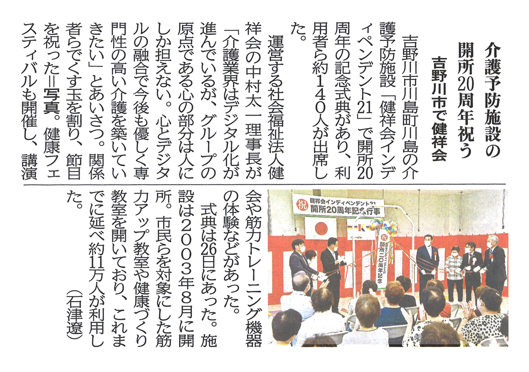 この記事は公開から1年以上経過しています メディア掲載記事 2023年8月31日(木) 介護予防施設の開所20周年祝う | 徳島新聞 ■徳島新聞(2023年8月31日朝刊) [記事公開日]2023/08/31(木) 健祥会インディペンデント21 介護予防施設の開所20周年祝う | 徳島新聞 新しい記事 感謝状にこちらこそ感謝! とくしまマラソン2023 古い記事 男女共同参画立県とくしまづくり賞 社会福祉法人緑風会も受賞 過去の記事へ