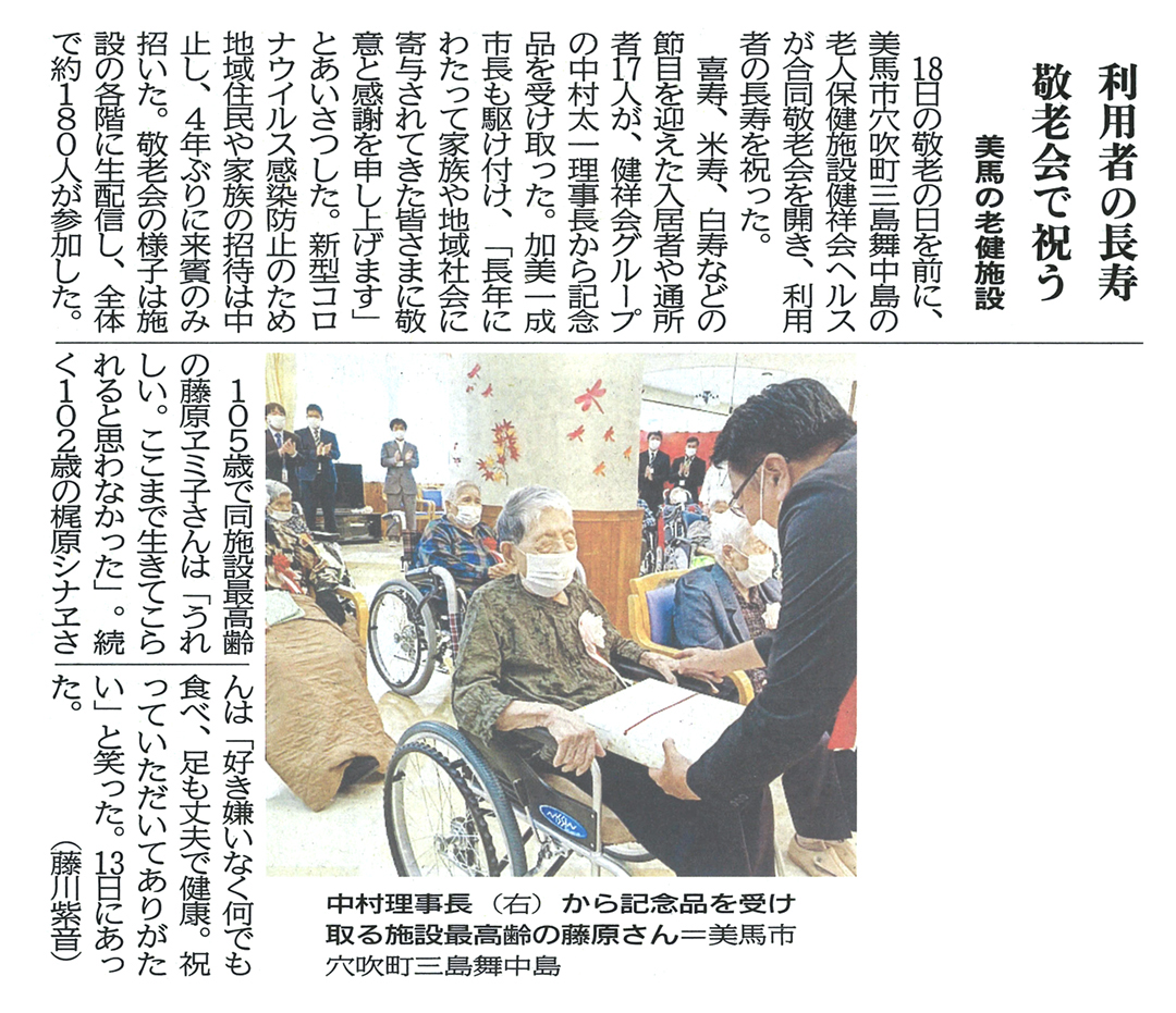 この記事は公開から1年以上経過しています メディア掲載記事 2023年9月17日(日) 利用者の長寿 敬老会で祝う | 徳島新聞 ■徳島新聞(2023年9月17日朝刊) [記事公開日]2023/09/19(火) 健祥会ヘルス 利用者の長寿 敬老会で祝う | 徳島新聞 新しい記事 白寿ら5人に記念品 | 徳島新聞 古い記事 利用者様のQOL向上のために! 栄養ケア・マネジメント勉強会開催 過去の記事へ