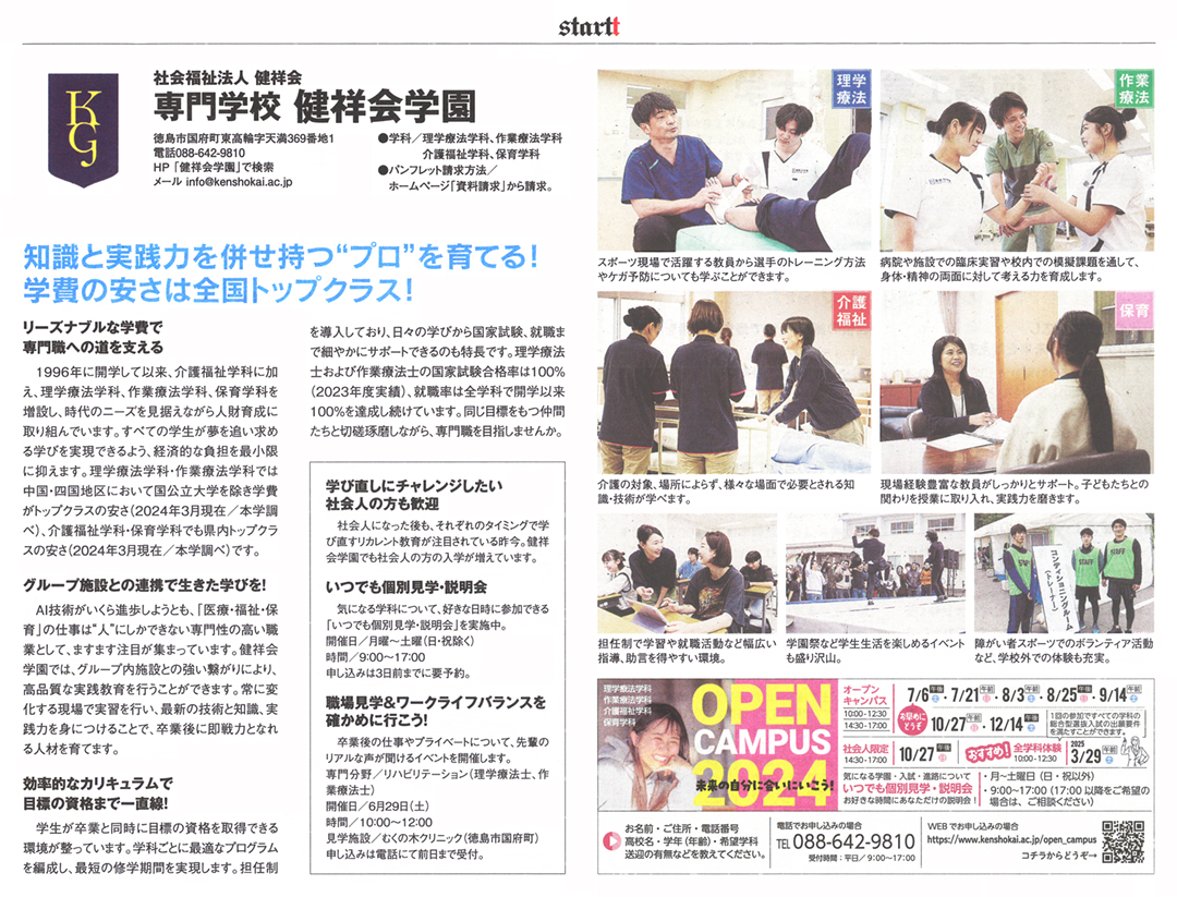この記事は公開から1年以上経過しています メディア掲載記事 2024年6月27日(木) 知識と実践力を併せ持つ“プロ”を育てる!学費の安さは全国トップクラス! | startt ■startt 6.27号 [記事公開日]2024/06/27(木) 専門学校健祥会学園 知識と実践力を併せ持つ“プロ”を育てる! 学費の安さは全国トップクラス! | startt 新しい記事 障害者の感覚を職員が類似体験 | 徳島新聞 古い記事 学ぶにつれて「なりたい!」気持ちが強く 仲間とともに作業療法を突き詰める | startt 過去の記事へ