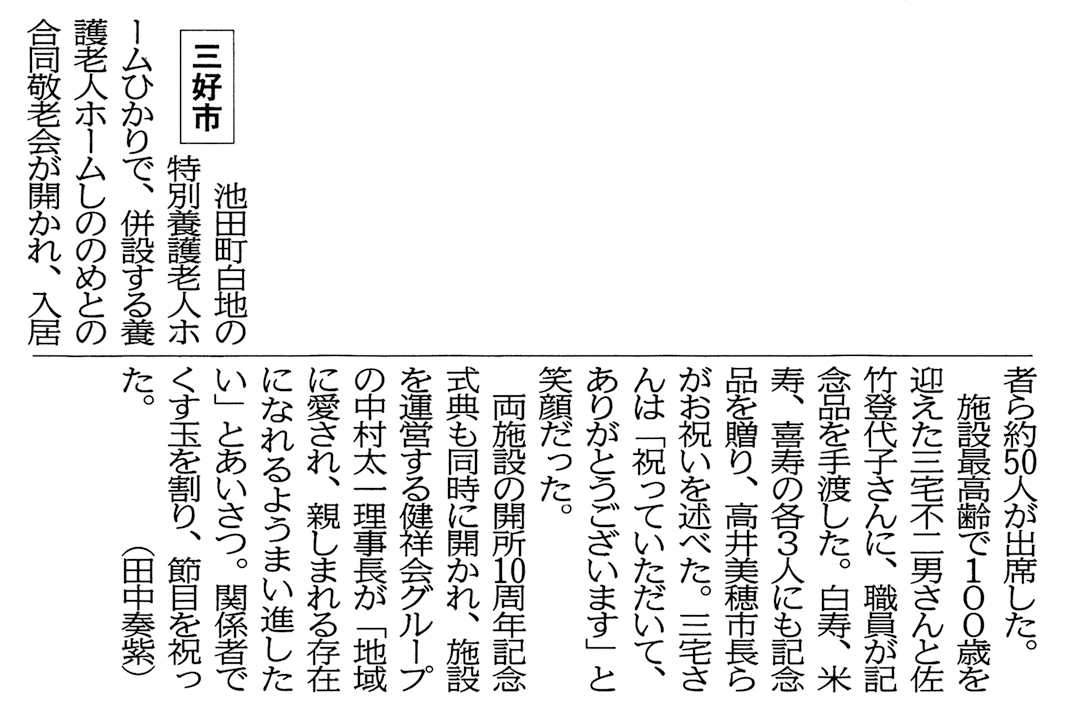 この記事は公開から1年以上経過しています メディア掲載記事 2024年9月17日(火) 元気で長生きしてね敬老の日 各地で祝う | 徳島新聞 ■徳島新聞(2024年9月17日朝刊) [記事公開日]2024/09/17(火) 特別養護老人ホームひかり養護老人ホームしののめ 元気で長生きしてね 敬老の日 各地で祝う | 徳島新聞 新しい記事 開所10周年と敬老の日、ふたつのお祝い 特別養護老人ホームひかり・養護老人ホームしののめ 古い記事 うれしいご長寿を言祝いで 健祥会グループ合同敬老会週間スタート 過去の記事へ