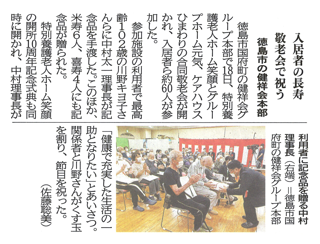 この記事は公開から1年以上経過しています メディア掲載記事 2024年9月19日(木) 入居者の長寿 敬老会で祝う | 徳島新聞 ■徳島新聞(2024年9月19日朝刊) [記事公開日]2024/09/19(木) 入居者の長寿 敬老会で祝う | 徳島新聞 新しい記事 ゲートボール 第22回 全国社会人大会 | 徳島新聞 古い記事 特別養護老人ホーム笑顔開所10周年 国府地区合同敬老会とともにお祝い 過去の記事へ