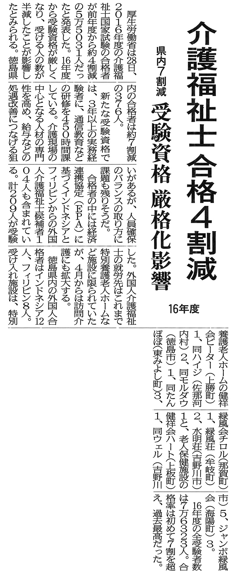 この記事は公開から1年以上経過しています メディア掲載記事 2017年3月29日(水) 介護福祉士 合格4割減 県内7割減 受験資格厳格化影響 16年度 │ 徳島新聞 ■徳島新聞(2017/03/29掲載) [記事公開日]2017/03/29(水) EPA介護福祉士候補者 介護福祉士 合格4割減 県内7割減 受験資格厳格化影響 16年度 │ 徳島新聞 新しい記事 嬉しい2台目! 日産サティオ徳島様より多目的電気自動車無償貸与 古い記事 女優・小山明子さん 夫の介護体験紹介 徳島市の健祥会 │ 徳島新聞 過去の記事へ