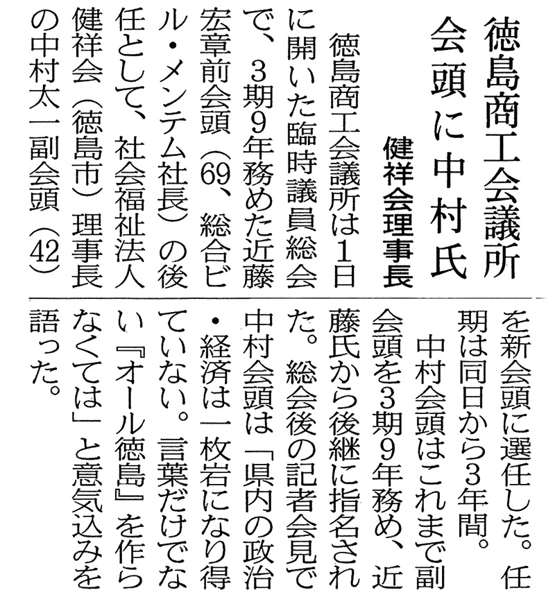 徳島商工会議所会頭に中村氏 健祥会理事長 │ 日本経済新聞