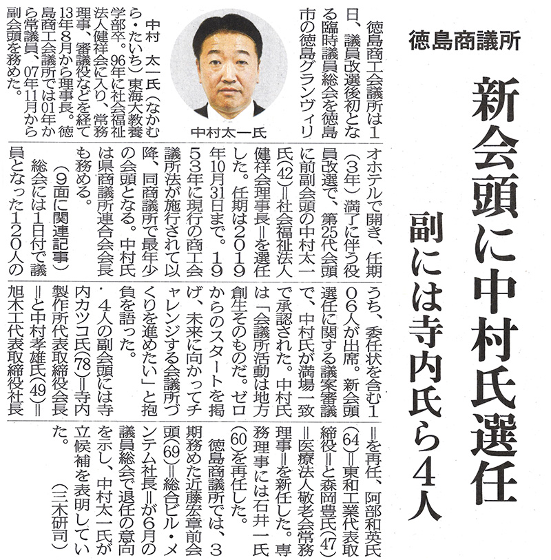 この記事は公開から1年以上経過しています メディア掲載記事 2016年11月2日(水) 徳島商工会議所 新会頭に中村氏選任 副には寺内氏ら4人 │ 徳島新聞 ■徳島新聞(2016/11/02掲載) [記事公開日]2016/11/02(水) 徳島商工会議所 新会頭に中村氏選任 副には寺内氏ら4人 │ 徳島新聞 新しい記事 「人」徳島商工会議所の第25代会頭に就任 中村太一さん │ 徳島新聞 古い記事 仕事・人・まちづくり挑戦 創業・事業引き継ぎ支援 徳島商議所新会頭中村氏に聞く │ 徳島新聞 過去の記事へ