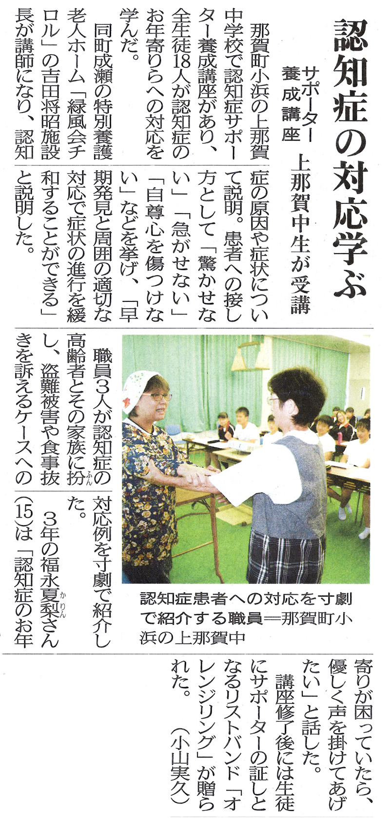 この記事は公開から1年以上経過しています メディア掲載記事 2016年10月15日(土) 認知症の対応学ぶ サポーター養成講座 上那賀中生が受講 │ 徳島新聞 ■徳島新聞(2016/10/15掲載) [記事公開日]2016/10/15(土) 緑風会チロル認知症サポーター養成講座 認知症の対応学ぶ サポーター養成講座 上那賀中生が受講 │ 徳島新聞 新しい記事 徳島労働局よりの巡視 腰痛予防の取り組みを見ていただきました! 古い記事 入所者や住民ら80人が長寿祝う 上板の老健施設 │ 徳島新聞 過去の記事へ