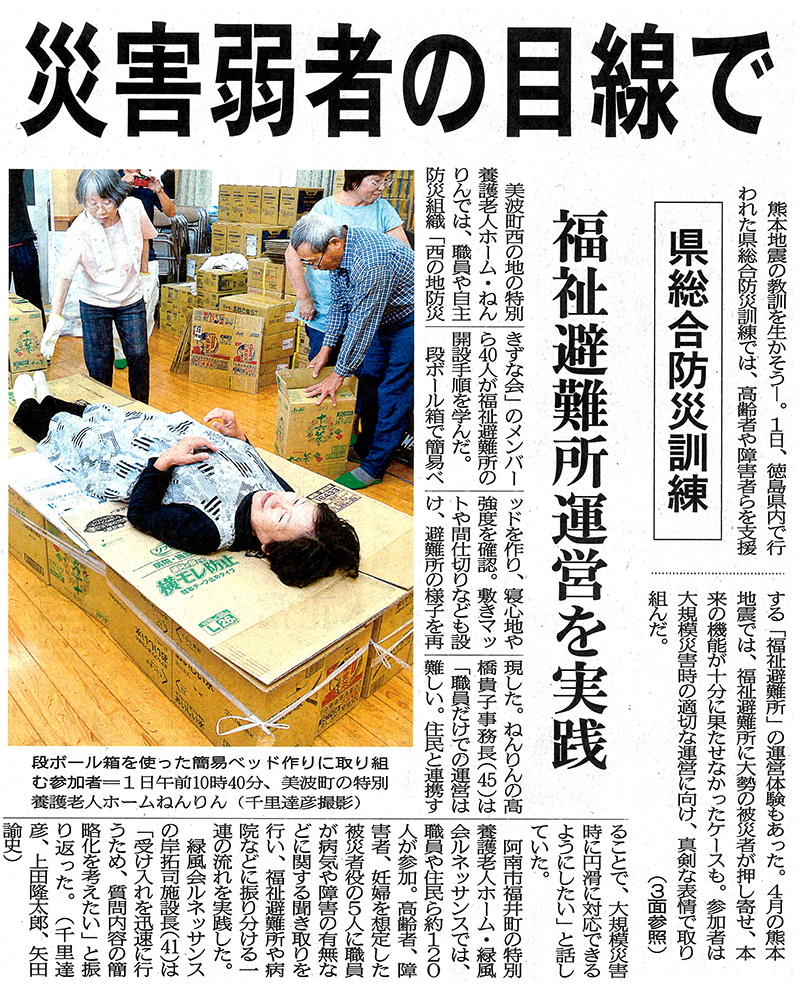 この記事は公開から1年以上経過しています メディア掲載記事 2016年9月2日(金) 災害弱者の目線で 県総合防災訓練 福祉避難所運営を実践 │ 徳島新聞 ■徳島新聞(2016/09/02掲載) [記事公開日]2016/09/02(金) 緑風会ルネッサンス防災訓練 災害弱者の目線で 県総合防災訓練 福祉避難所運営を実践 │ 徳島新聞 新しい記事 不審者の侵入を想定し防犯訓練 │ 徳島新聞 古い記事 防災の日 身を守れ訓練様々 │ 読売新聞 過去の記事へ