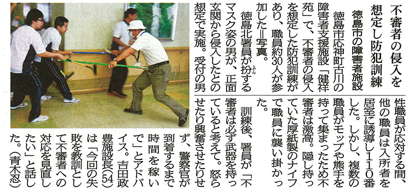 この記事は公開から1年以上経過しています メディア掲載記事 2016年9月2日(金) 不審者の侵入を想定し防犯訓練 │ 徳島新聞 ■徳島新聞(2016/09/02掲載) [記事公開日]2016/09/02(金) 健祥苑防犯訓練 不審者の侵入を想定し防犯訓練 │ 徳島新聞 新しい記事 防災の日、迫真の大規模防災訓練実施 古い記事 災害弱者の目線で 県総合防災訓練 福祉避難所運営を実践 │ 徳島新聞 過去の記事へ