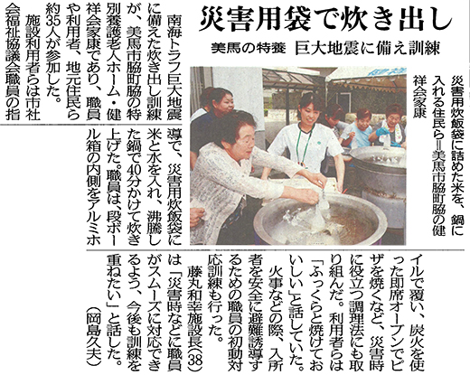 この記事は公開から1年以上経過しています メディア掲載記事 2016年8月6日(土) 災害用袋で炊き出し 美馬の特養 巨大地震に備え訓練 │ 徳島新聞 ■徳島新聞(2016/08/06掲載) [記事公開日]2016/08/06(土) 健祥会家康 災害用袋で炊き出し 美馬の特養 巨大地震に備え訓練 │ 徳島新聞 新しい記事 いのちを明日へとつなぐ、 むくの木セレモニー 古い記事 介護福祉士目指す ベトナム人11人受け入れ 健祥会で辞令交付 │ 徳島新聞 過去の記事へ