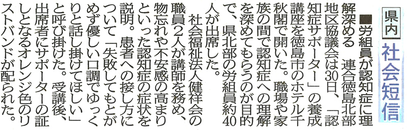 この記事は公開から1年以上経過しています メディア掲載記事 2016年7月31日(日) 労組員が認知症に理解深める │ 徳島新聞 ■徳島新聞(2016/07/31掲載) [記事公開日]2016/07/31(日) 認知症サポーター養成講座 労組員が認知症に理解深める │ 徳島新聞 新しい記事 ベトナムから3期生11名を迎えて ~平成28年度ベトナム介護福祉士候補者辞令交付式 古い記事 「ありがとう」はこの世でいちばん美しい言葉 ~健祥会グループ感謝の日 過去の記事へ