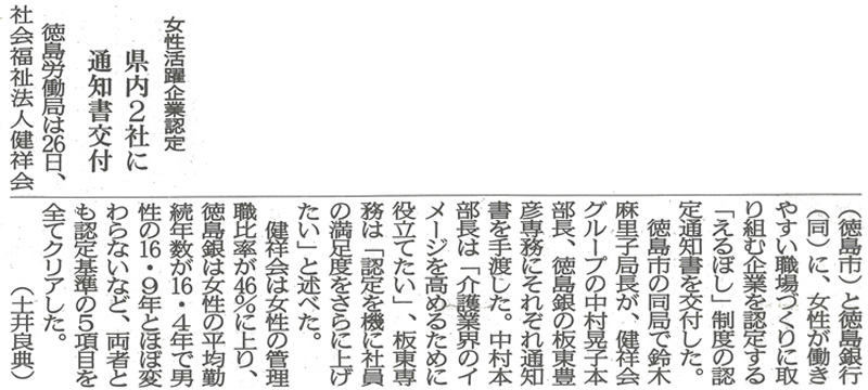この記事は公開から1年以上経過しています メディア掲載記事 2017年4月27日(木) 女性活躍企業認定県内2社に通知書交付 | 徳島新聞 ■徳島新聞(2017/04/27掲載) [記事公開日]2017/04/27(木) えるぼし働きやすい職場づくり 女性活躍企業認定 県内2社に通知書交付 | 徳島新聞 新しい記事 「えるぼし」で 女性が働きやすい職場 最高位の三つ星認定! 古い記事 女性が働きやすい職場づくり 「えるぼし」県内初認定 労働局発表 健祥会と徳島銀 │徳島新聞 過去の記事へ