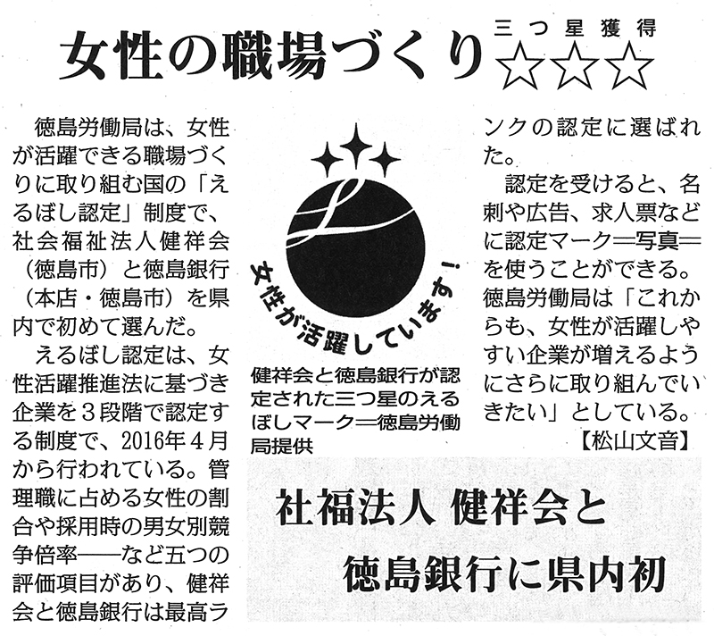 女性の職場づくり☆☆☆ 社福法人健祥会と徳島銀行に県内初|毎日新聞