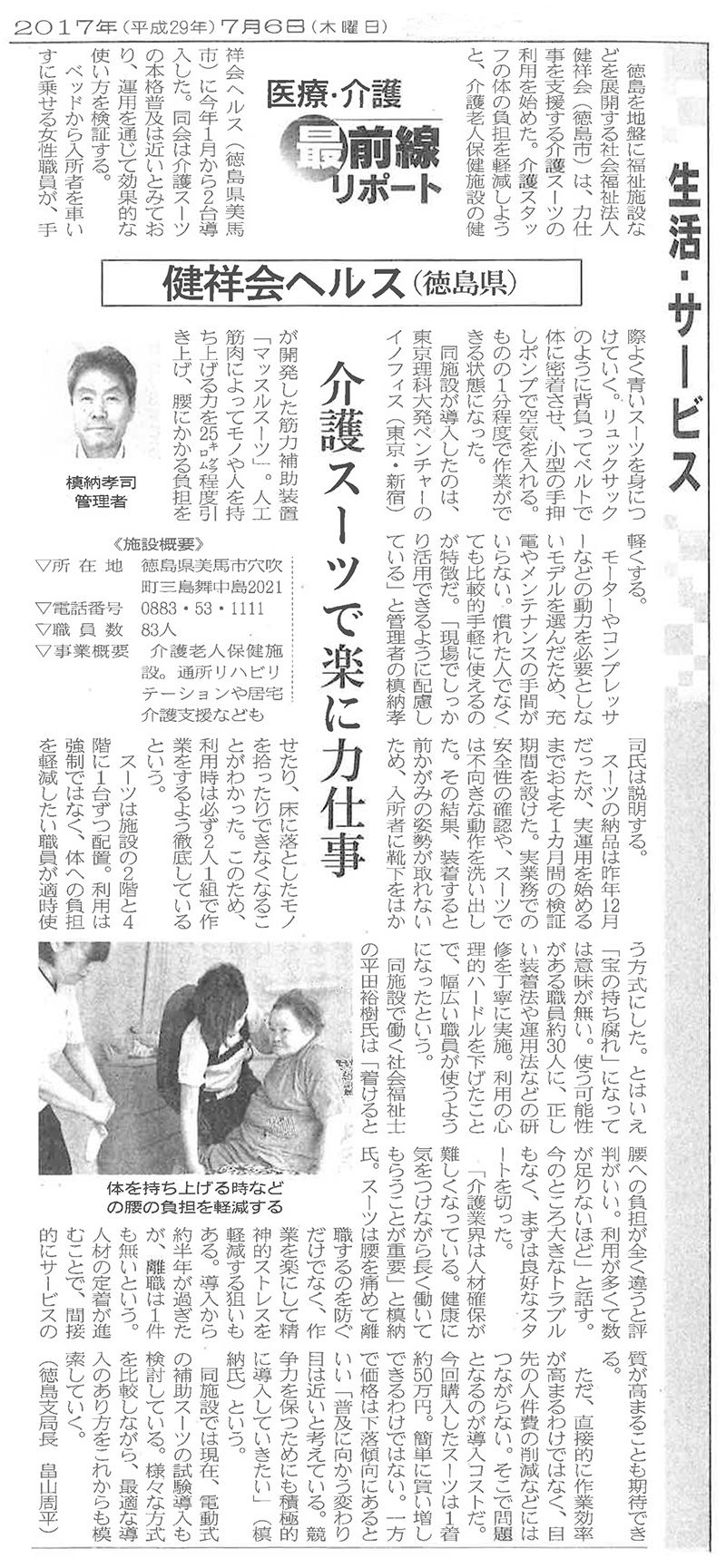 この記事は公開から1年以上経過しています メディア掲載記事 2017年7月6日(木) 介護スーツで楽に力仕事 | 日経産業新聞 ■日経産業新聞(2017年7月6日) [記事公開日]2017/07/08(土) 健祥会ヘルス 介護スーツで楽に力仕事 | 日経産業新聞 新しい記事 「健祥会家康開所15周年」 ありがとう!これからも! バルーンに感謝と決意を込めて 古い記事 「親子で学ぼう 水害時の対応」 とくしま健祥会保育園で子育て公開講座 過去の記事へ