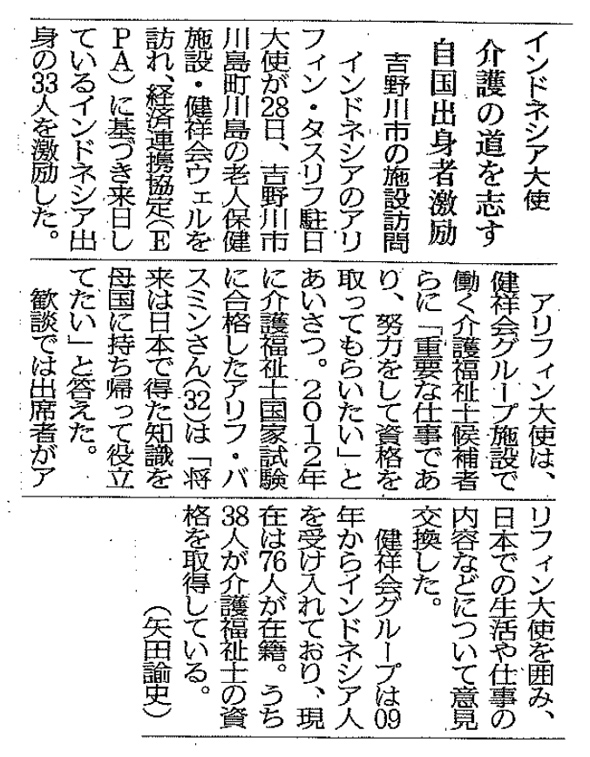 介護の道志す自国出身者激励│徳島新聞