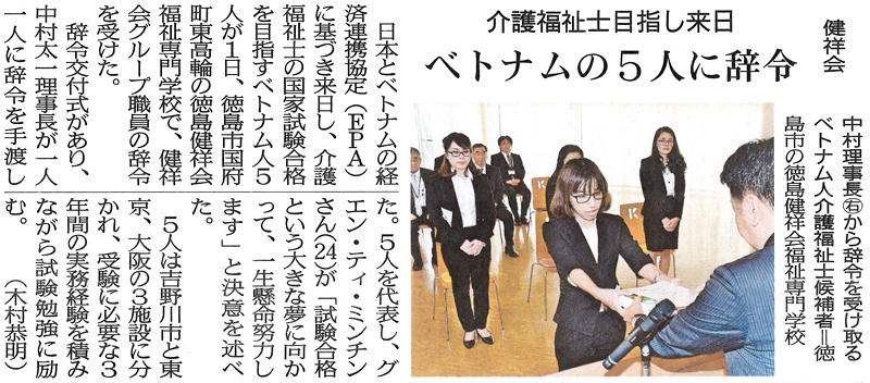 この記事は公開から1年以上経過しています メディア掲載記事 2017年8月2日(水) 介護福祉士目指し来日 ベトナムの5人に辞令 健祥会│徳島新聞 ■徳島新聞 2017/8/2(WED)掲載 ベトナムからの介護福祉士候補4期生を迎えて [記事公開日]2017/08/02(水) 辞令交付式 介護福祉士目指し来日 ベトナムの5人に辞令 健祥会│徳島新聞 新しい記事 暮らしの悩み 連携対処 | 徳島新聞 古い記事 ベトナムからの介護福祉士候補4期生を迎えて 過去の記事へ
