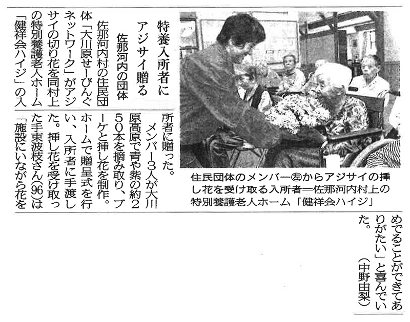 この記事は公開から1年以上経過しています メディア掲載記事 2017年9月6日(水) 特養入所者にアジサイ贈る | 徳島新聞 ■徳島新聞(2017年9月6日) [記事公開日]2017/09/11(月) 健祥会ハイジ 特養入所者にアジサイ贈る | 徳島新聞 新しい記事 獅子舞や花火を楽しむ | 徳島新聞 古い記事 健祥会本部長、パネリストとして登壇 「高齢社会をよくする女性の会全国大会inとくしま」 過去の記事へ