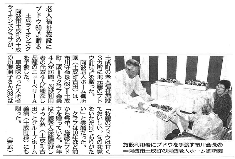 この記事は公開から1年以上経過しています メディア掲載記事 2017年9月16日(土) 老人福祉施設にブドウ60キロ贈る | 徳島新聞 ■徳島新聞(2017年9月16日) [記事公開日]2017/09/19(火) 義満 老人福祉施設にブドウ60キロ贈る | 徳島新聞 新しい記事 9月18日は敬老の日 全国38ヶ所で合同敬老会を開催します 古い記事 獅子舞や花火を楽しむ | 徳島新聞 過去の記事へ