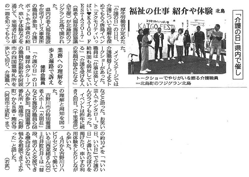 この記事は公開から1年以上経過しています メディア掲載記事 2017年11月12日(日) 業務への理解を歩き遍路で訴え | 徳島新聞 ■徳島新聞(2017年11月12日) [記事公開日]2017/11/13(月) 介護の日吉野川リハビリセンター水明荘 業務への理解を歩き遍路で訴え | 徳島新聞 新しい記事 美意識 若者に負けん 高齢者モデルにショー|徳島新聞 古い記事 働き方改革理解深める | 徳島新聞 過去の記事へ