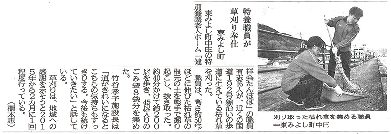 この記事は公開から1年以上経過しています メディア掲載記事 2017年12月31日(日) 特養職員が草刈り奉仕 | 徳島新聞 ■徳島新聞 (2017年12月31日) [記事公開日]2018/01/05(金) 健祥会たんぽぽ 特養職員が草刈り奉仕 | 徳島新聞 新しい記事 あけましておめでとうございます! 一人ひとりが確かな成長をめざして! 古い記事 KIRARI セミナー 「プロカメラマンによる写真の撮り方セミナー」開催! 過去の記事へ