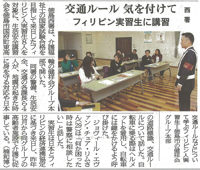 この記事は公開から1年以上経過しています メディア掲載記事 2018年1月11日(木) 交通ルール 気をつけてフィリピン実習生に講習 | 徳島新聞 ■徳島新聞 (2018年1月11日) [記事公開日]2018/01/12(金) EPA介護福祉士候補者 交通ルール 気をつけて フィリピン実習生に講習 | 徳島新聞 新しい記事 新春トップインタビュー│徳島新聞 古い記事 あけましておめでとうございます! 一人ひとりが確かな成長をめざして! 過去の記事へ