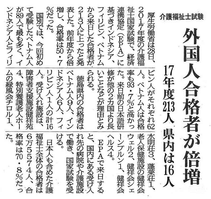 この記事は公開から1年以上経過しています メディア掲載記事 2018年3月29日(木) 介護福祉士試験 外国人合格者が倍増 | 徳島新聞 ■徳島新聞(2018/03/29)掲載 [記事公開日]2018/04/05(木) EPA介護福祉士候補者健祥会ウェル健祥会シェーンブルン健祥会ヘルス水明荘緑風会チロル 介護福祉士試験 外国人合格者が倍増 | 徳島新聞 新しい記事 地域情報 会話のツール 福祉施設新入職員が研修 | 徳島新聞 古い記事 麗らかな春の日 健祥会グループ4園で入園式 過去の記事へ