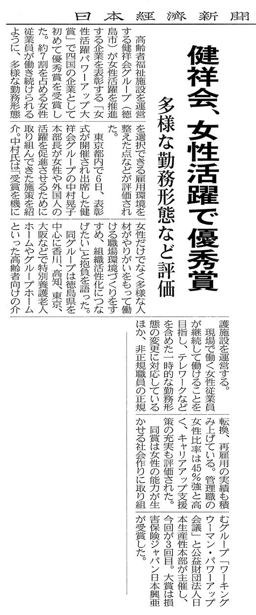 健祥会、女性活躍で優秀賞│日本経済新聞