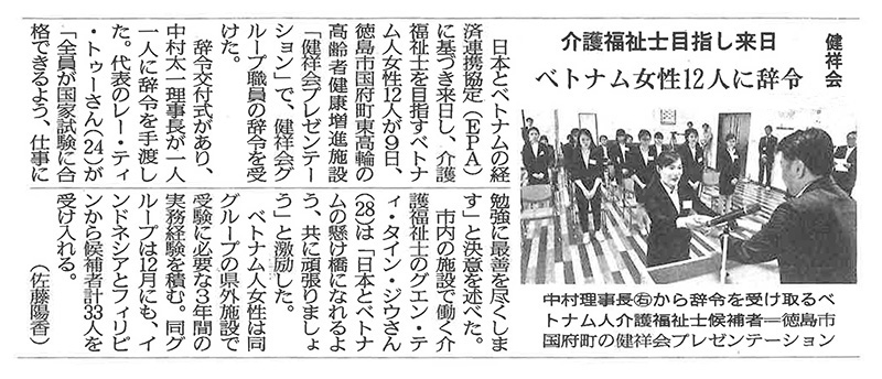 この記事は公開から1年以上経過しています メディア掲載記事 2018年8月10日(金) 介護福祉士目指し来日ベトナム女性12人に辞令 | 徳島新聞 ■徳島新聞(2018/08/10掲載) [記事公開日]2018/08/15(水) [最終更新日]2018/09/29(土) EPA介護福祉士候補者ベトナム 介護福祉士目指し来日 ベトナム女性12人に辞令 | 徳島新聞 新しい記事 職員親睦懇談会で 飯泉嘉門徳島県知事がサプライズスピーチ! 古い記事 【2018阿波おどり】 「健祥会グループ連」「健祥会ちるど連」 この街の 魂の踊り 永遠に! 過去の記事へ