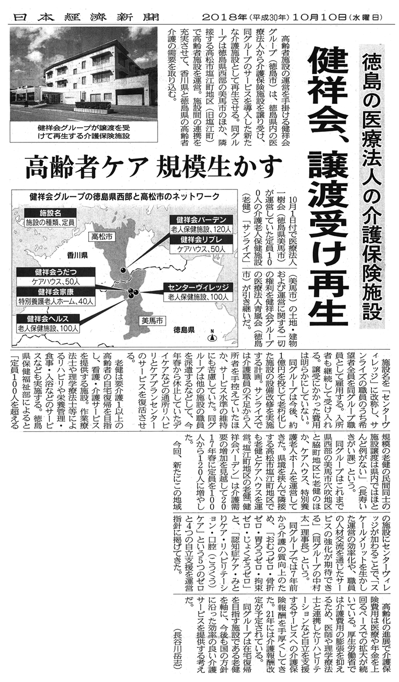 この記事は公開から1年以上経過しています メディア掲載記事 2018年10月10日(水) 健祥会、譲渡受け再生 | 日本経済新聞 ■日本経済新聞(2018/10/10掲載) 新たな気持ちでスタートを! 介護老人保健施設「センターヴィレッジ」 脇町にオープン [記事公開日]2018/10/10(水) [最終更新日]2018/11/10(土) センターヴィレッジ医療法人青嵐会 健祥会、譲渡受け再生 | 日本経済新聞 新しい記事 健祥会カップ争奪東四国国体記念 第26回四国オープンゲートボール選手権大会 古い記事 利用者と住民ら150人が長寿祝う│徳島新聞 過去の記事へ